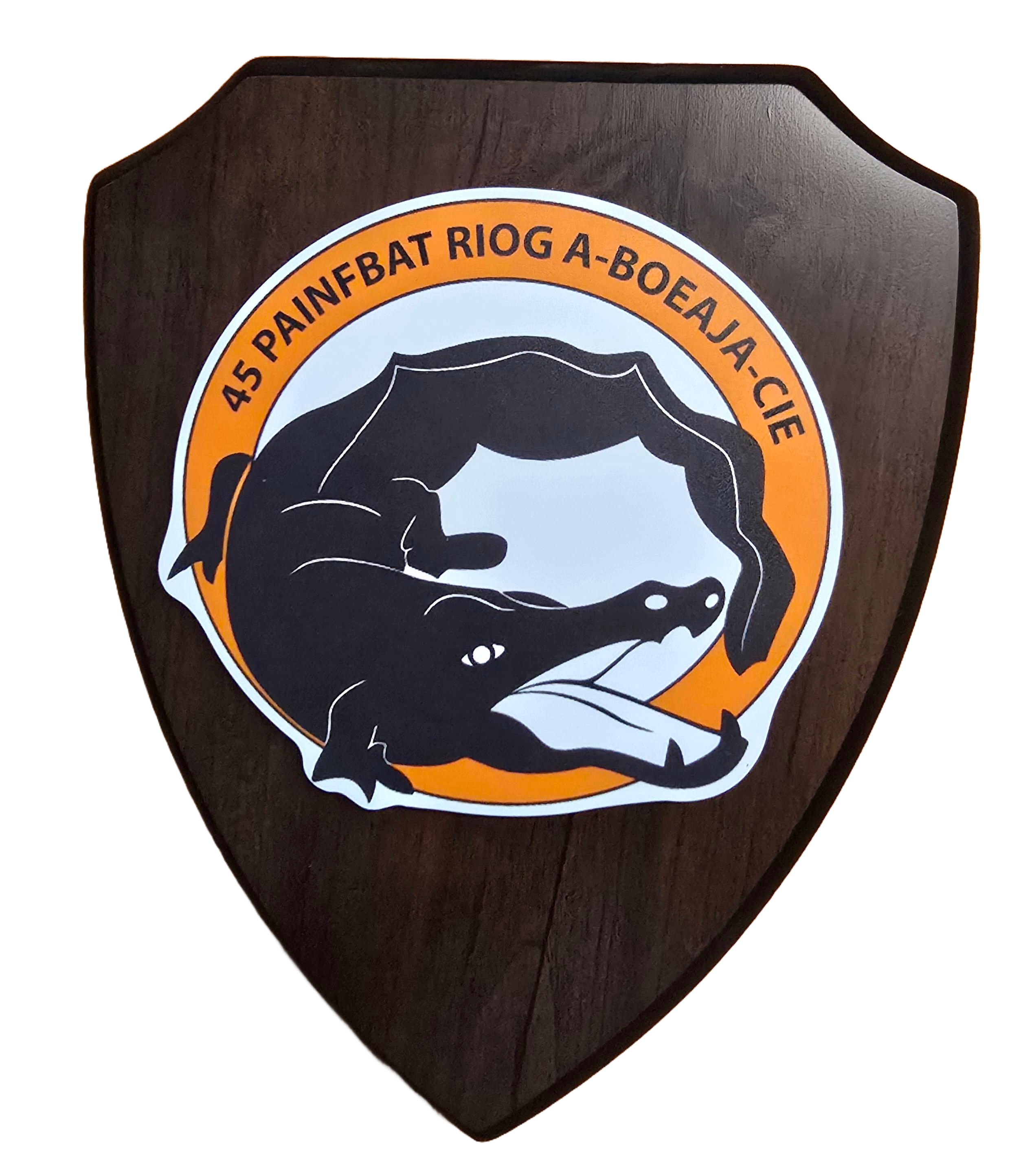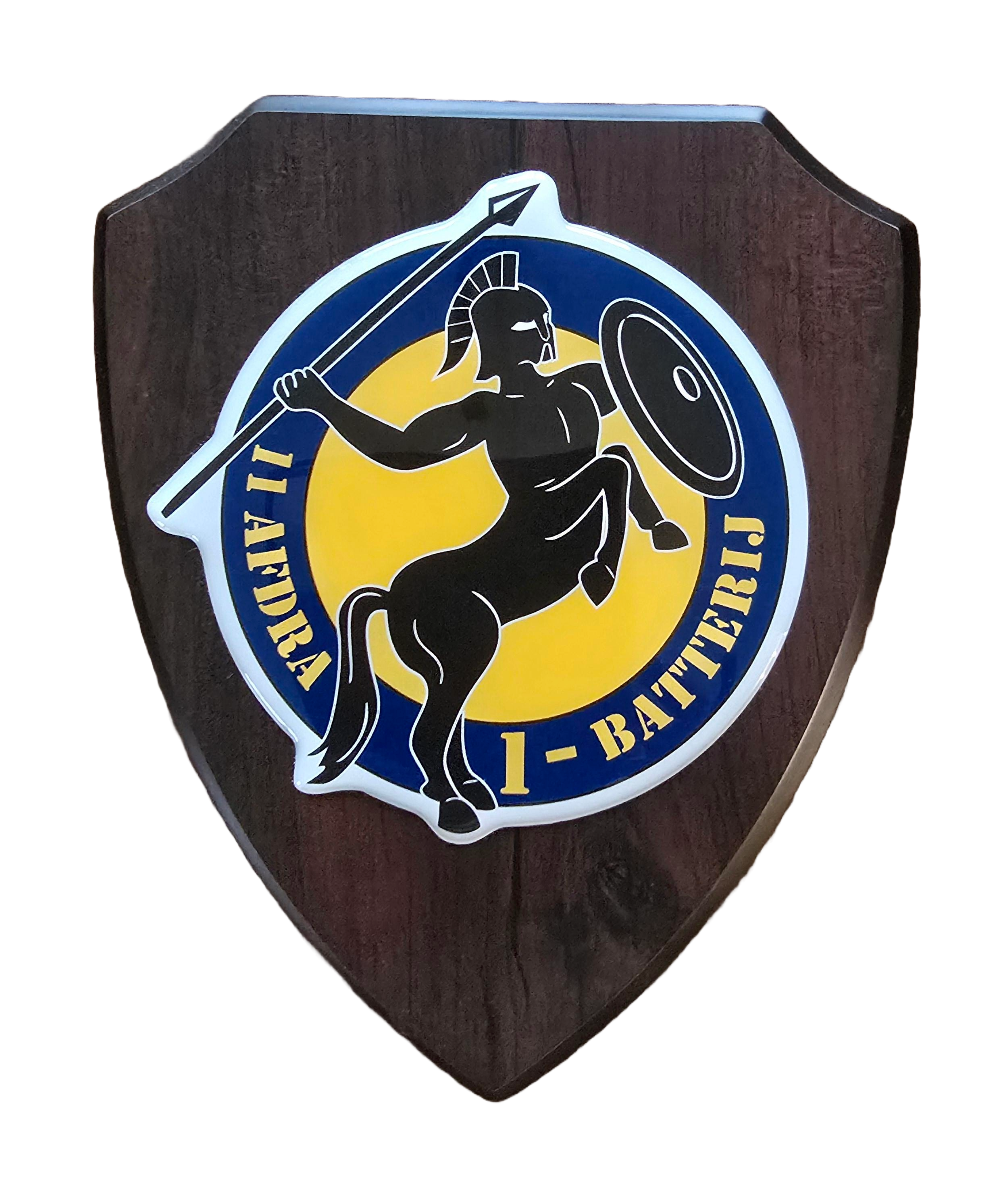Wapenschild silkscreen op massief hout met 3D metalen embleem