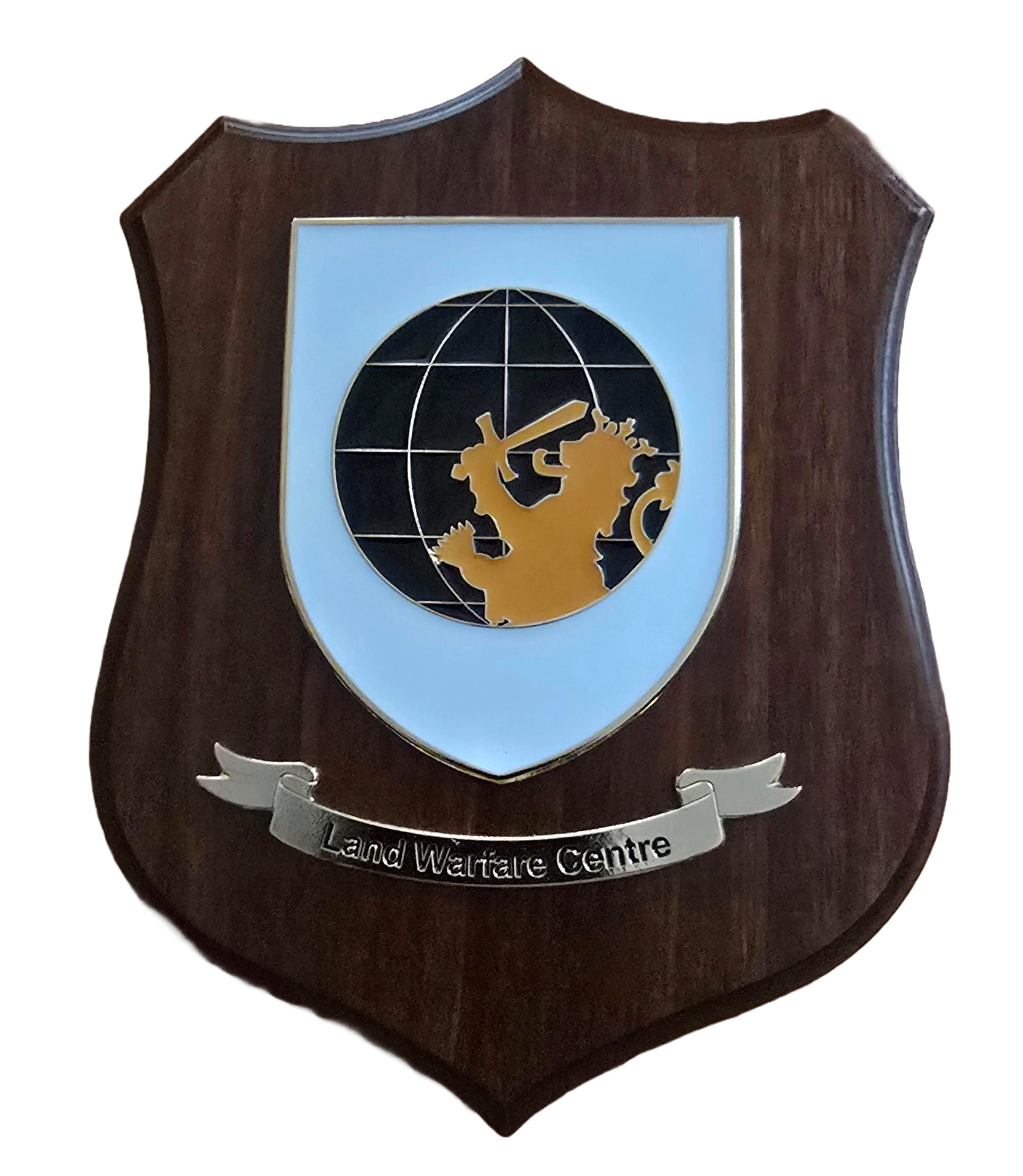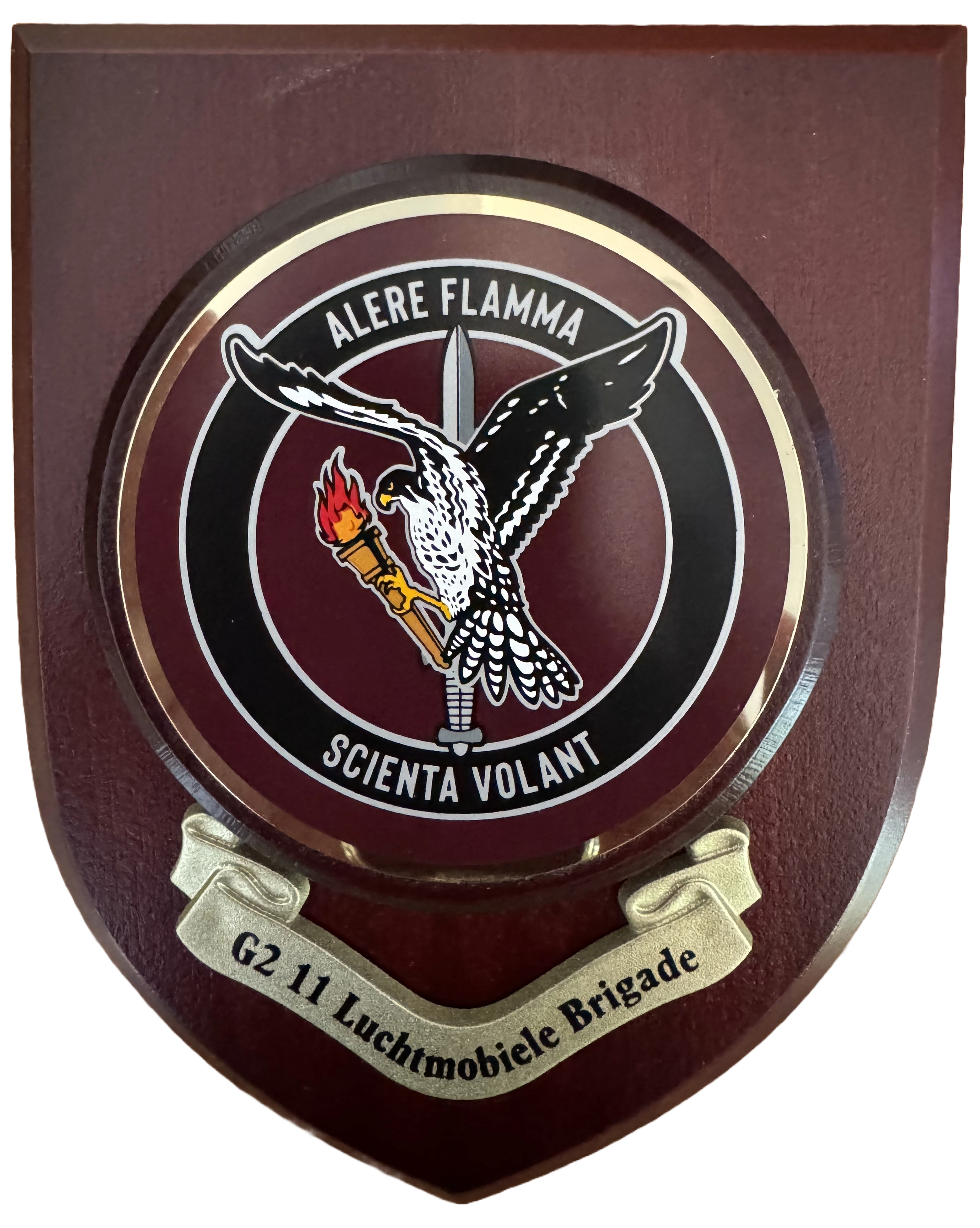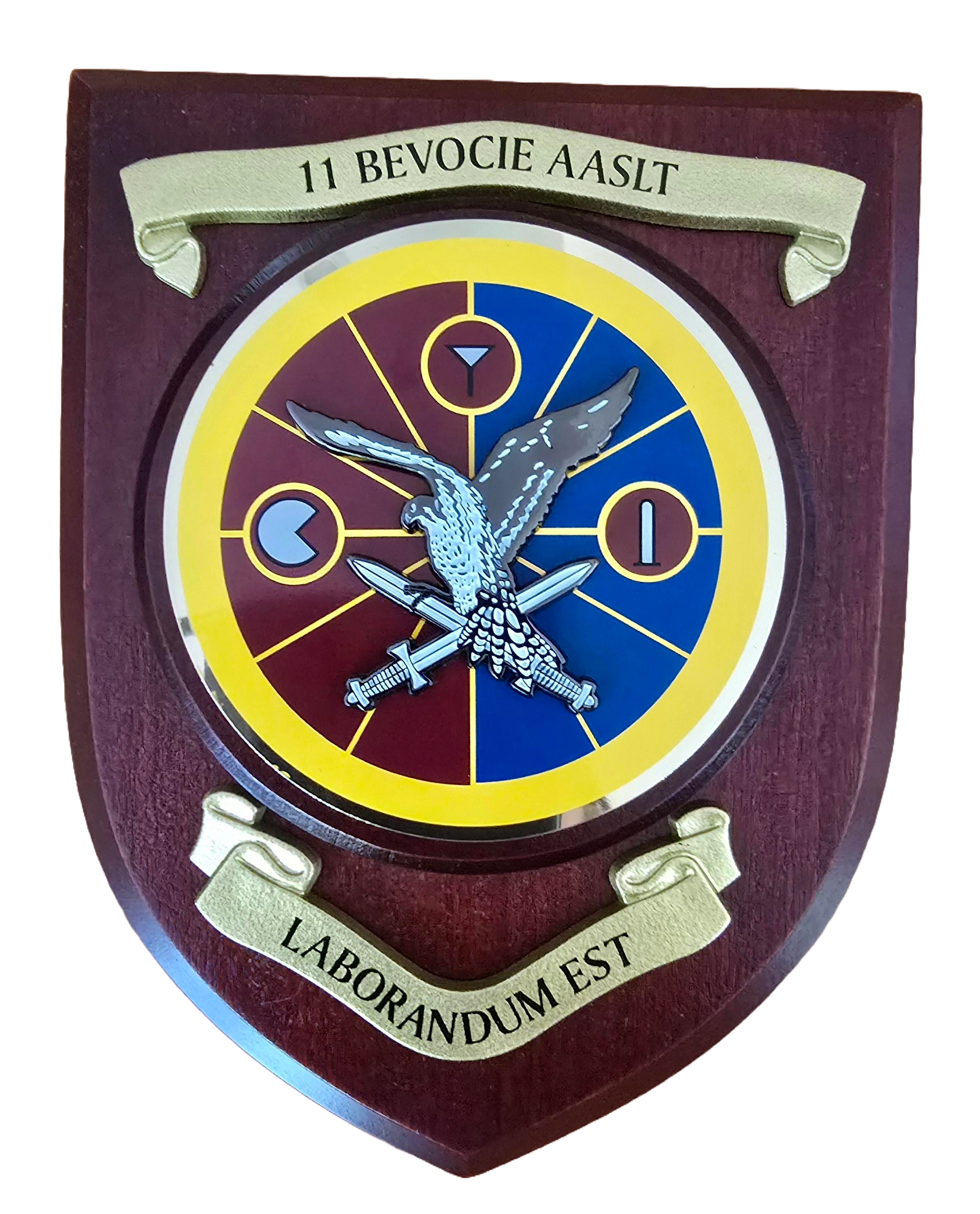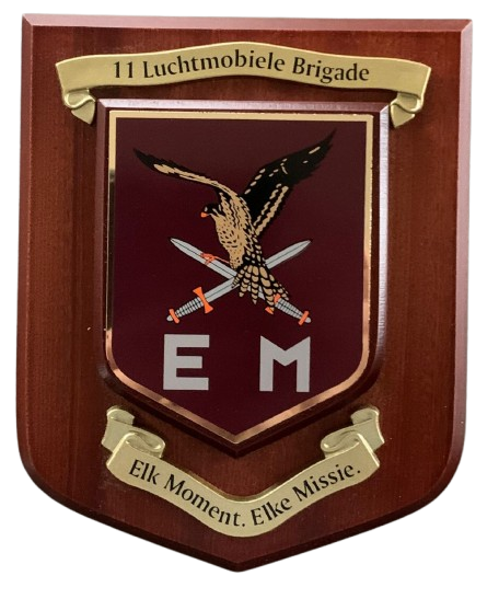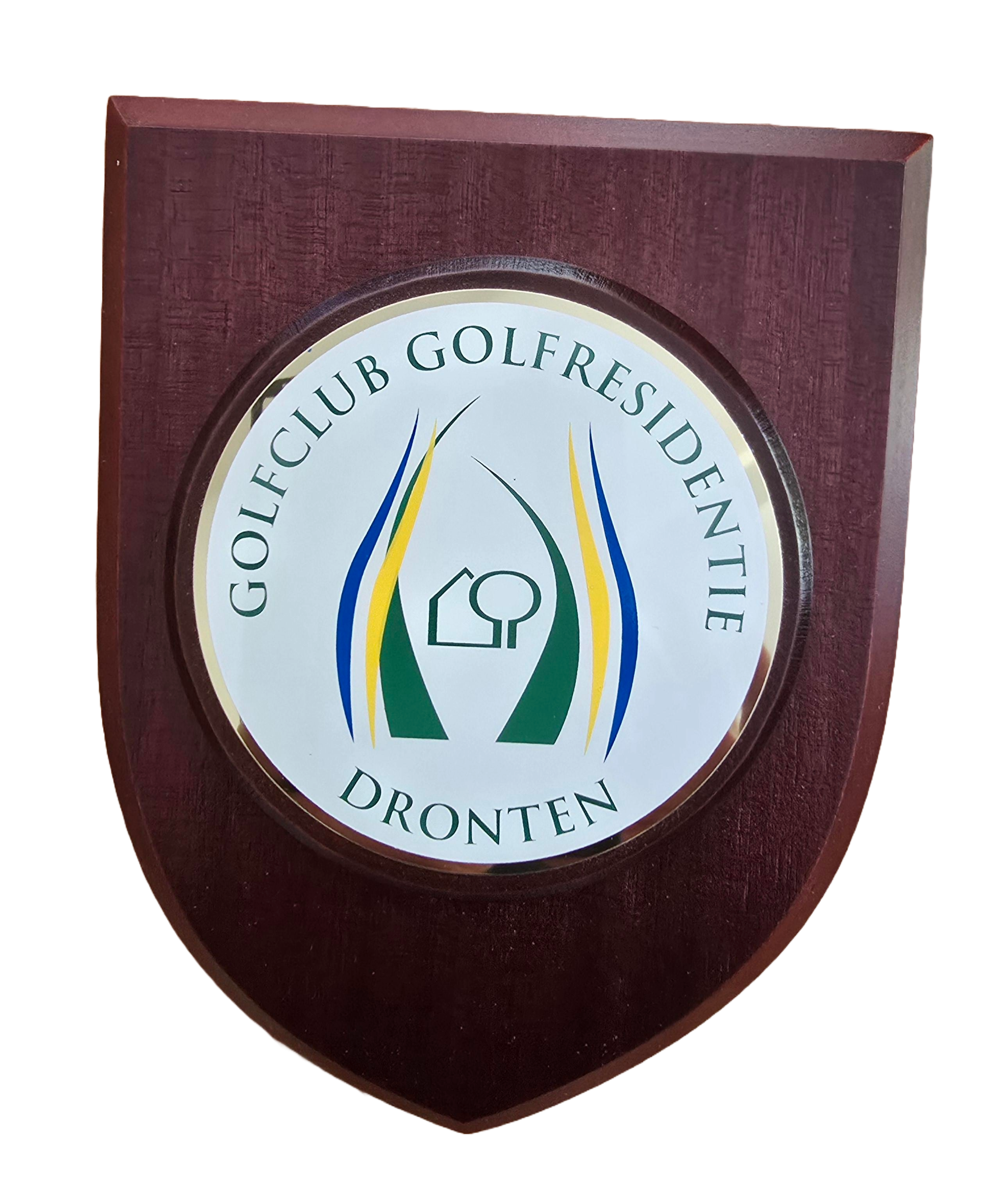 Wapenschild silkscreen op massief hout met 3D metalen embleem